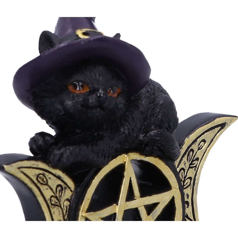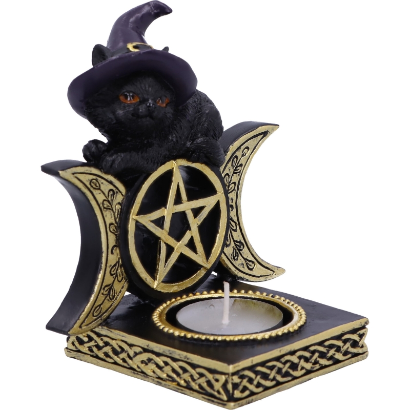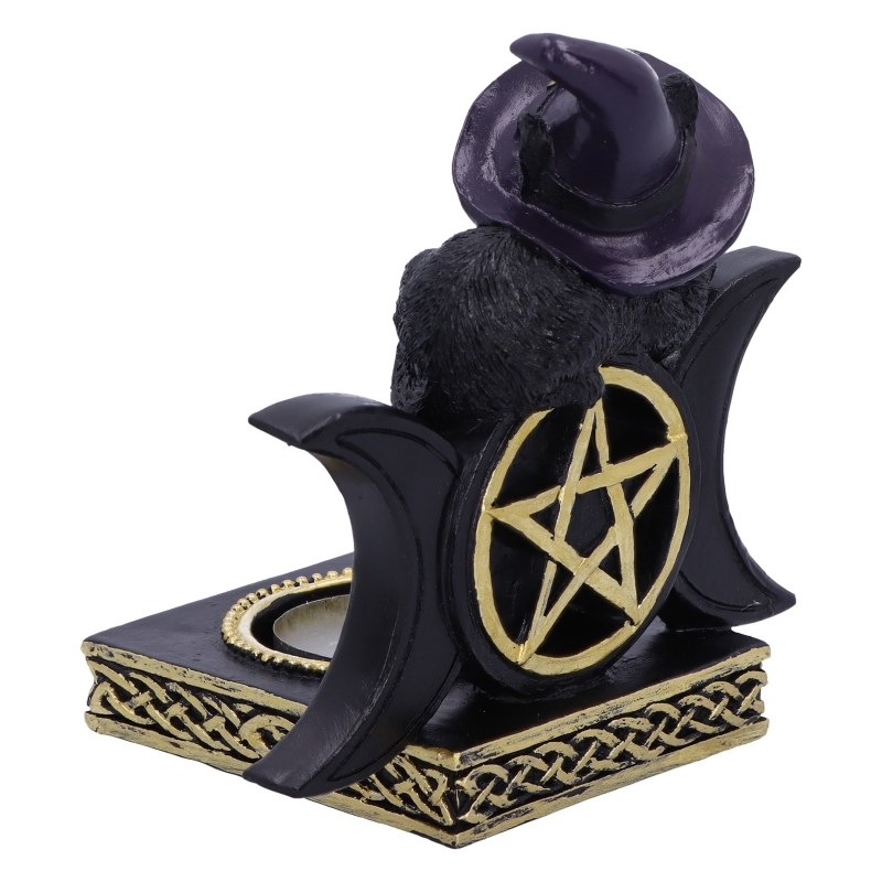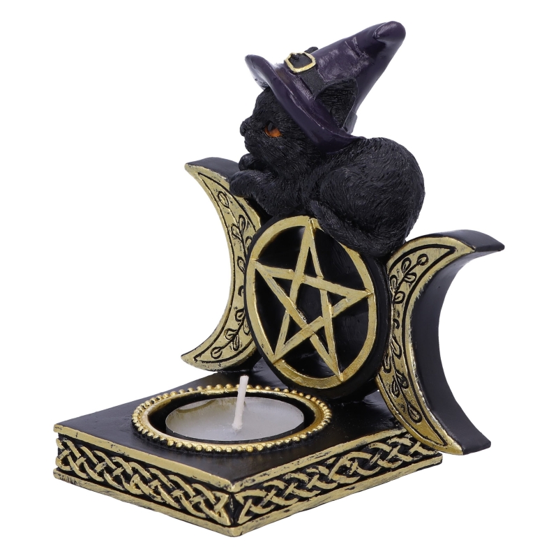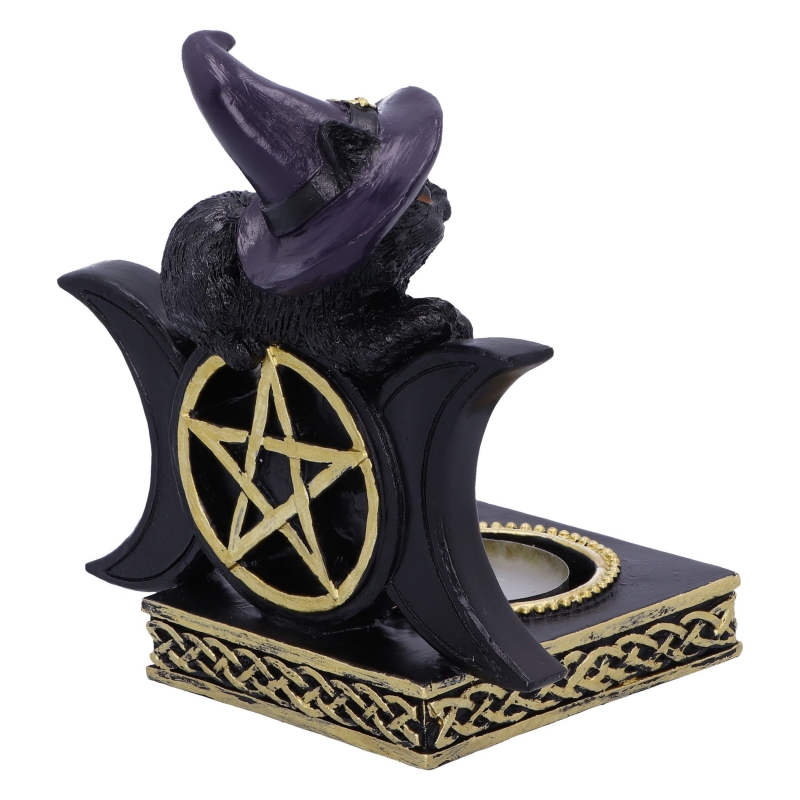 Aquí está el portavelas Black Magic. Adornado en oro radiante, el diseño de la triple luna brilla con un encanto celestial, mientras que un gato caprichoso con un sombrero de bruja se posa encima. Elaborado con la mejor resinay pintado a mano por expertos, este encantador soporte añade un toque de magia a cualquier espacio.